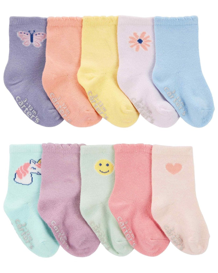 Deixe a sua baby mais fofinha e com os seus pezinhos protegidos com o Kit meia bebê 10 pares barra em ripple ícones multicor | Carter's. Feito de algodão, poliéster e elastano, o kit conta com meias super confortáveis, com cores variadas, acabamento em ripple, estampa de ícones e traz um charminho único, perfeito para acompanhar essa fase fofinha de seu bem mais precioso. Aproveite!