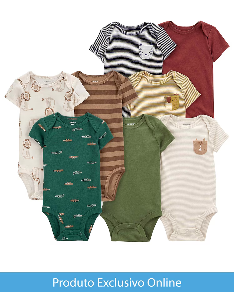 O Enxoval bebê 8 peças listrado jacaré multicor | Carter's será a pedida certa para aliar conforto e economia para o seu bebê. Produzido em algodão, o enxoval vem com oito bodies de manga curta, ombros traspassados e variam entre estampas diversas, mas também em versões lisas. Aproveite!
