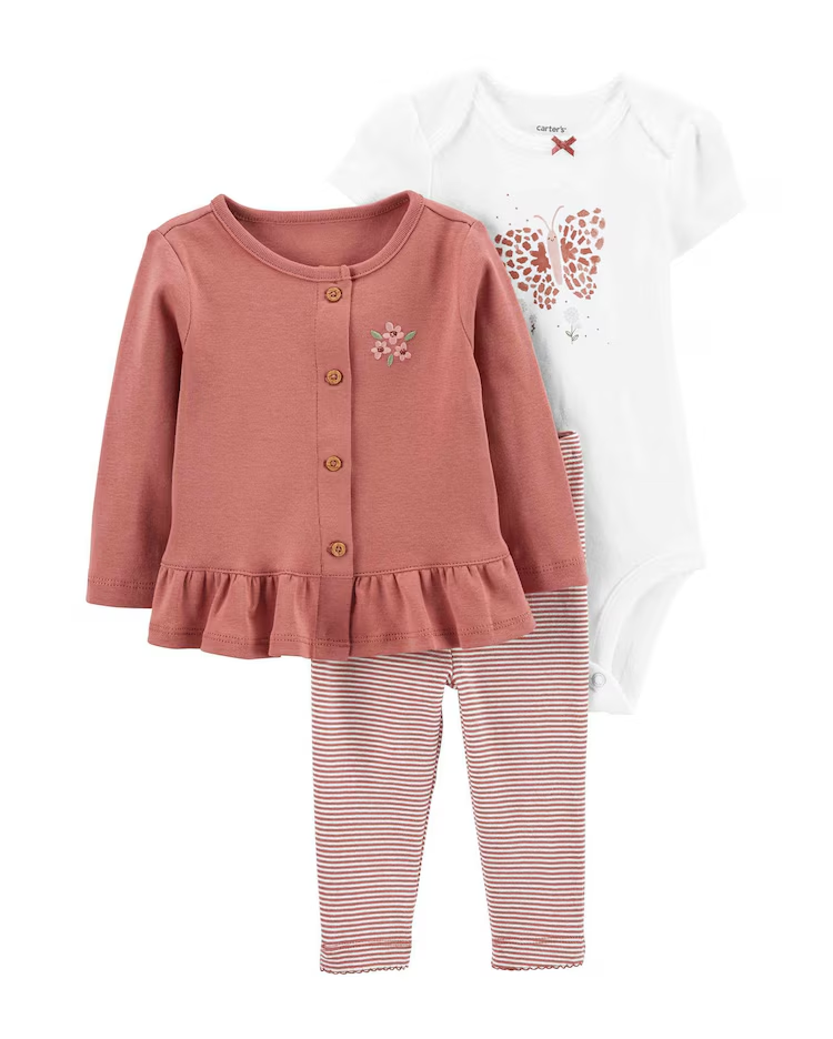 Pensado especialmente para dias mais gelados, o Conjunto longo bebê 3 peças listrado e borboleta rosa | Carter's é a pedida ideal para deixar sua bebê bem aquecida. O conjunto conta com 1 body com estampa, 1 calça com cós elástico listrada e 1 casaco com mangas longas. Super aconchegante e quentinho, o conjunto vai proteger a sua bebê e ela ainda vai ficar uma gracinha!